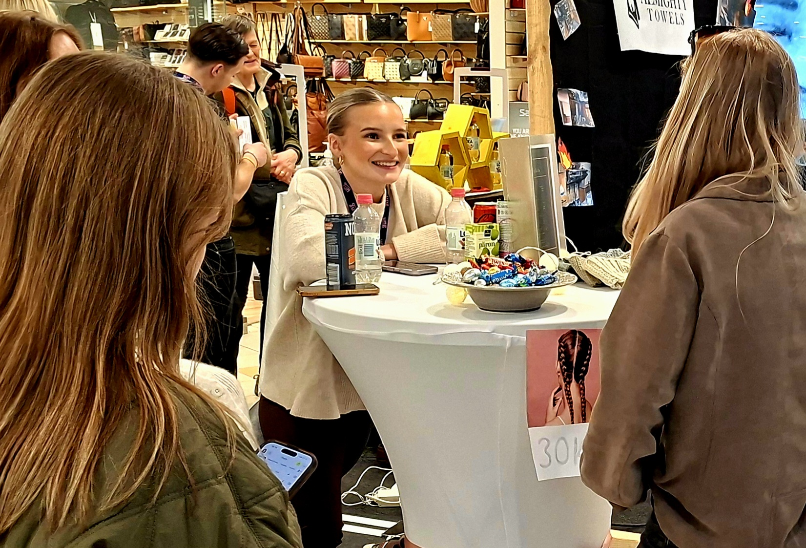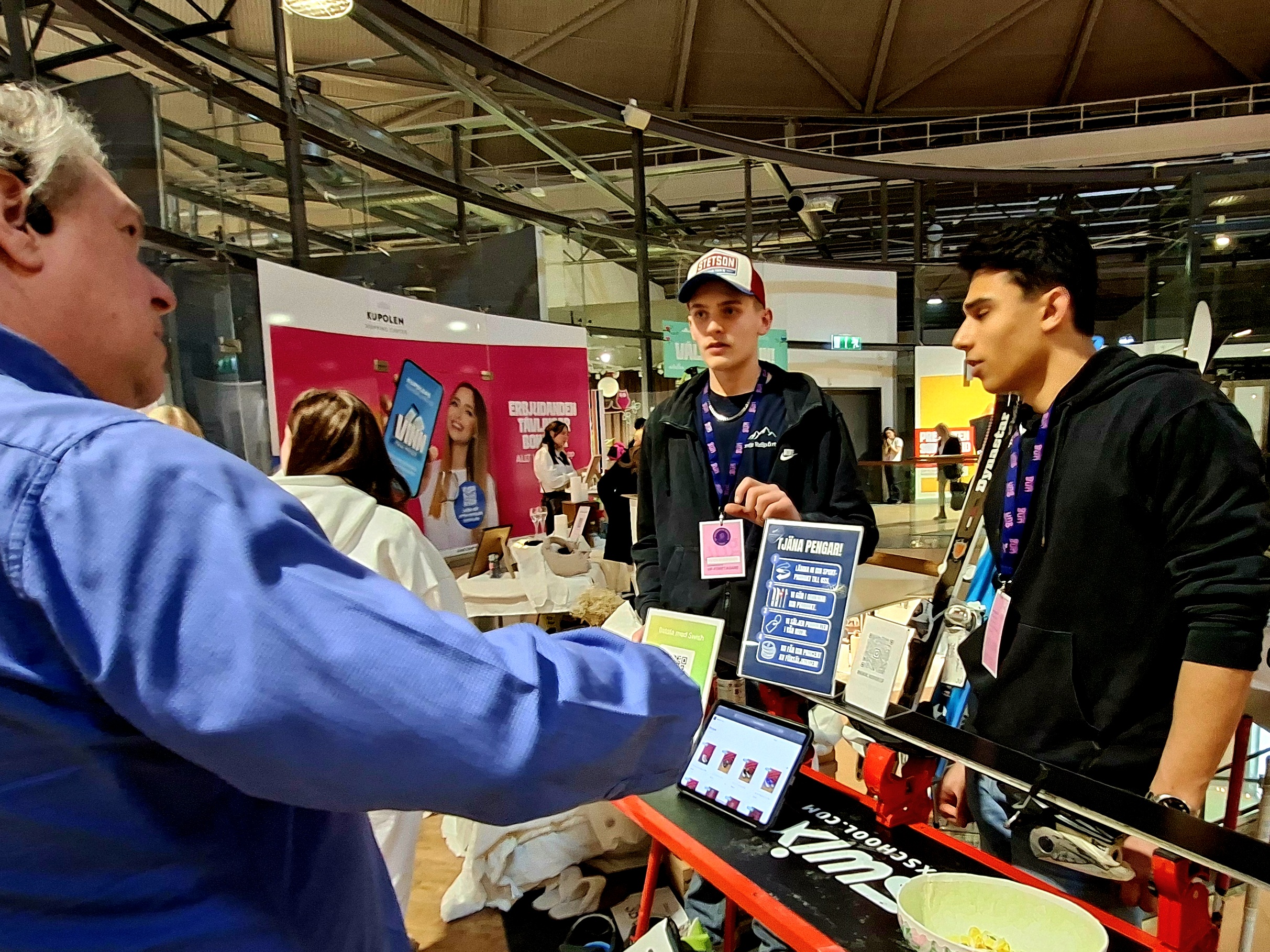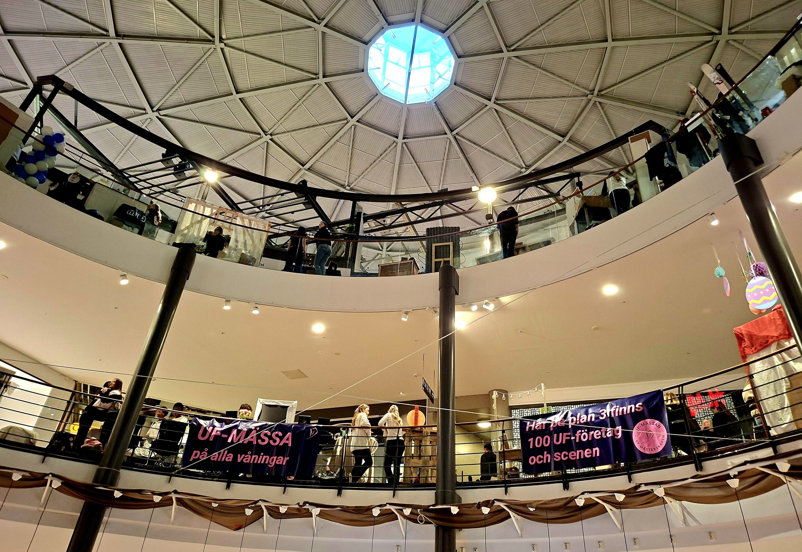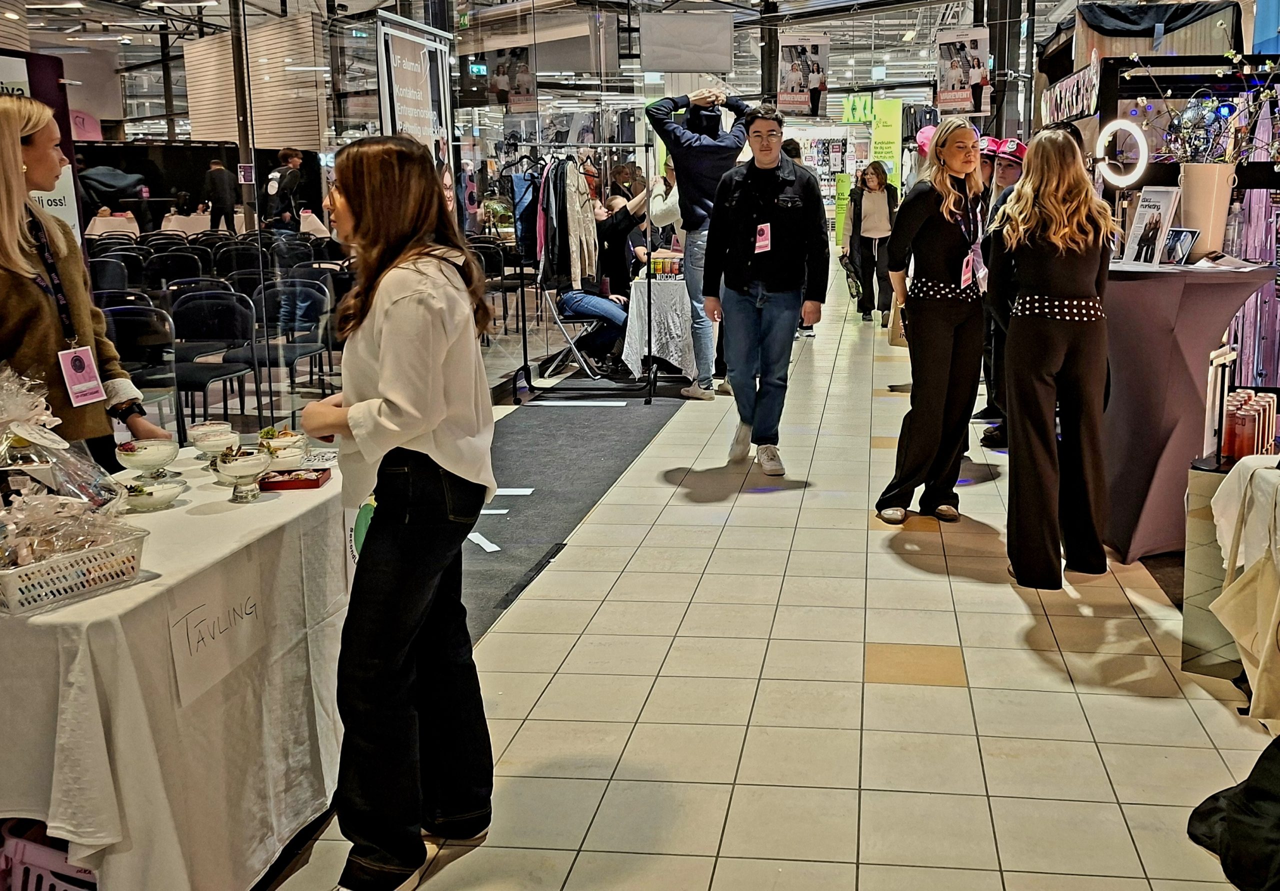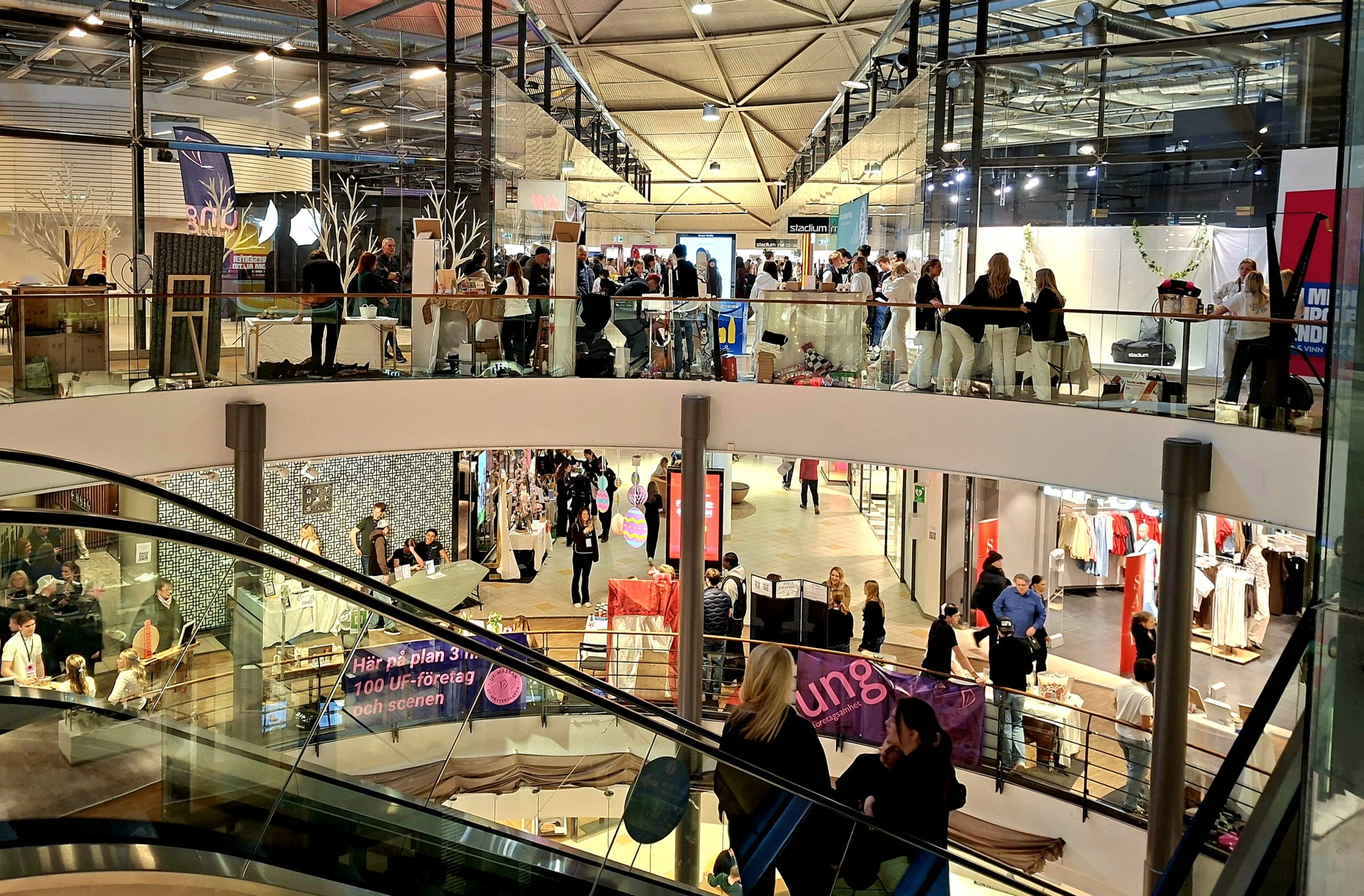 Längs gångarna på alla plan stod UF-företag uppställda sida vid sida. Här såldes produkter, presenterades tjänster och pitchades idéer – samtidigt som eleverna mötte både kunder och jurygrupper.