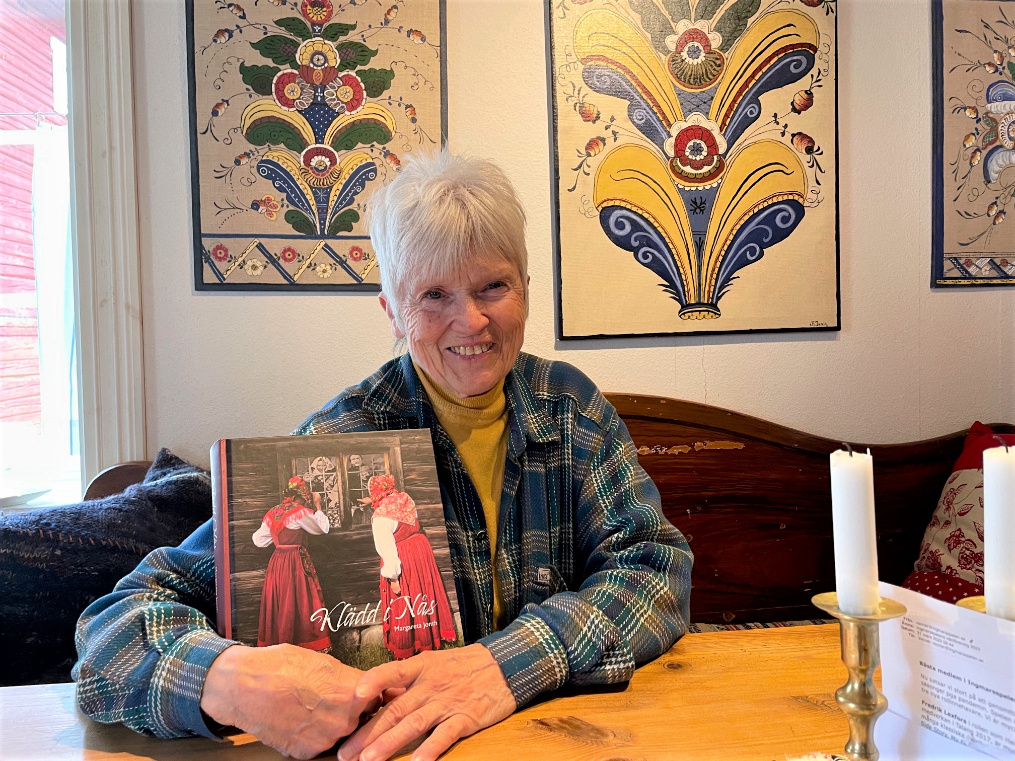 Resultatet har nu blivit en färgstark bok ”Klädd i Nås- där frå då dôm kam tä dôm drog å” där hon beskriver klädskicket i en gammal dalasocken under 400 år.