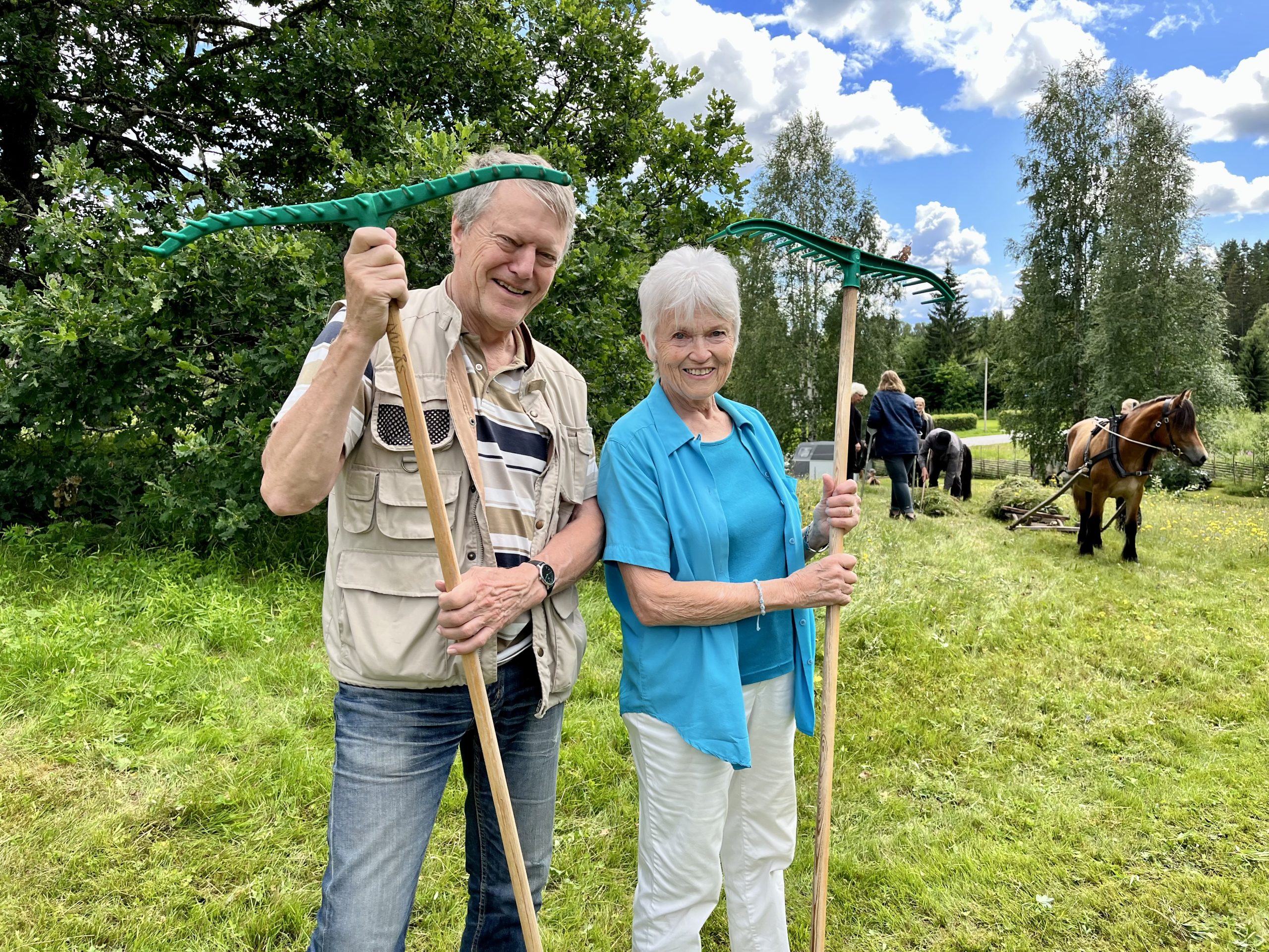 De hemtama besökarna Margareta Jonth och Leif Lyttkens berömde de underbara hästarna samtidigt som de gjorde sig redo att rycka in för att hjälpa till att räfsa upp det som hann bli slaget.
