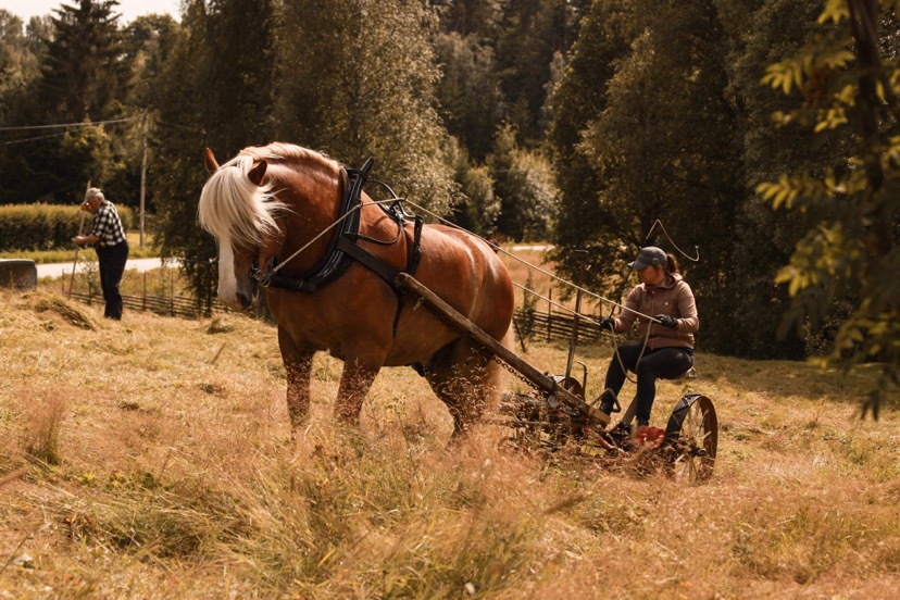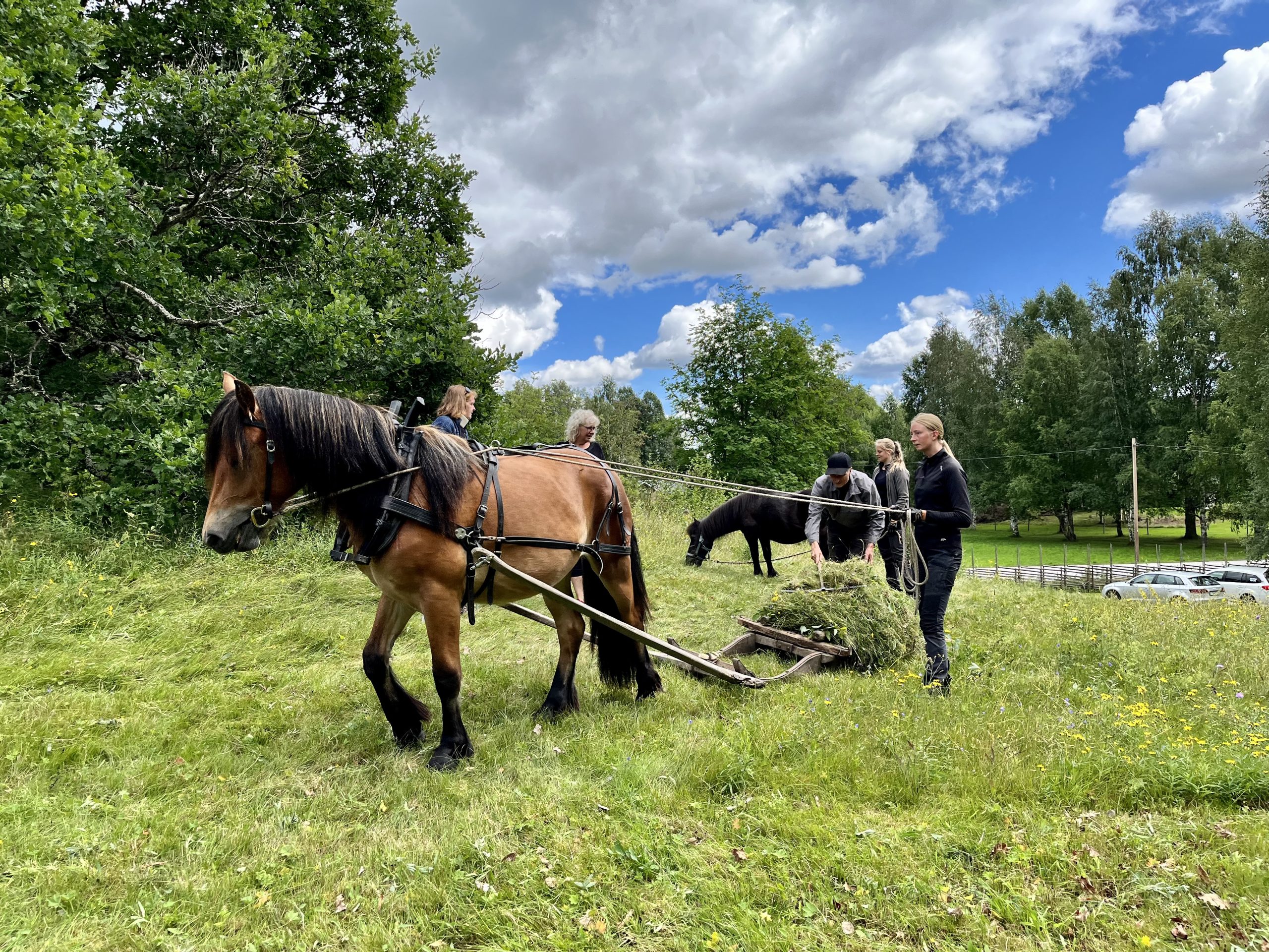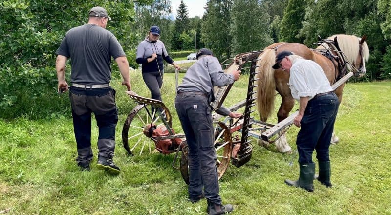 Det skulle slås med både häst och lie. På plats fanns Emma Olofsson med ”kändishästen” Zeus som nu skådespelat färdigt i Ingemarsspelen och istället fått i uppdrag att dra slåttermaskinen vid Lisskvarngården.